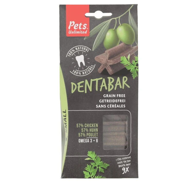 Cold pressed Dentabar is high in meat with Chicken (57% ) and Potato. Dentabar contains Olive Oil, (which help reduce harmful bacteria) Parsley (a natural breath freshener) and spinach extracts (Spinach is a good source of iron, Vitamin A, Vitamin C and folic acid. These vitamins and minerals will improve your dental health). Dentabar has no added sugar and is Grain & Gluten free. Dentabar’s are cold-pressed at temperatures below 50 ° C. Cold pressing ingredients mean that the cell structures of the ingredients containing the vitamins and minerals are maintained. These would normally be lost in the extrusion process. No additional fats or flavouring is required. No artificial colours or preservatives are added. Available in Small, Medium and Large sizes. One stick a day will keep the dentist away!