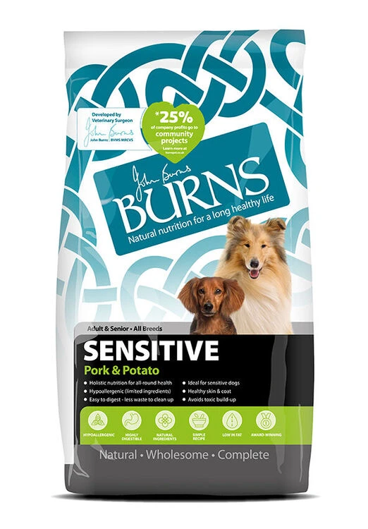 Burns Sensitive+ is hypo-allergenic, so it is suitable for sensitive dogs. It is formulated without ingredients such as wheat, soya, dairy, artificial colourings and artificial preservatives which are known to cause symptoms of food intolerance including itchy skin, digestive upset, excessive moulting, full anal glands and waxy ears.