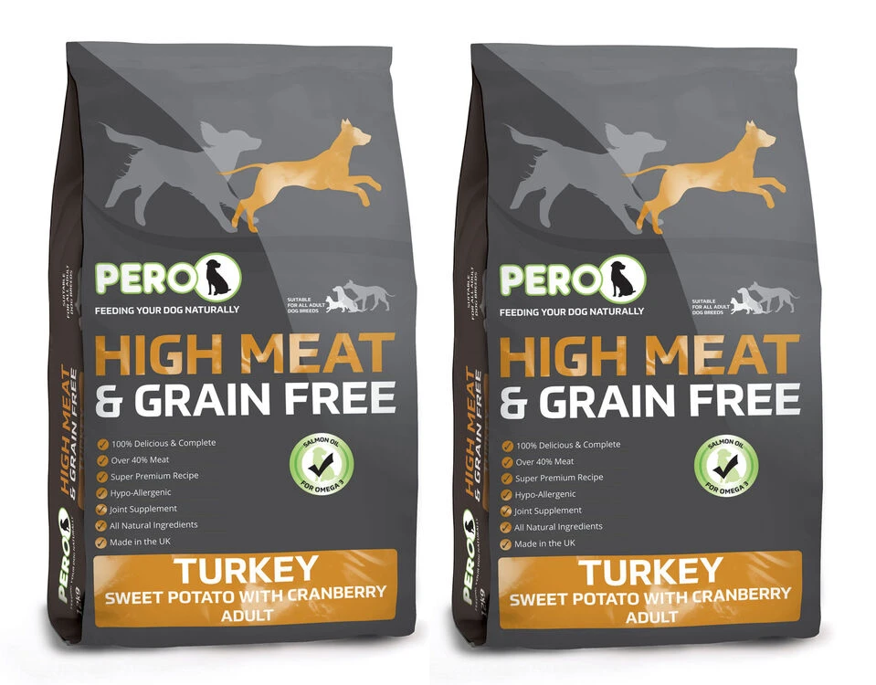 Pero High Meat Grain Free Turkey, Sweet Potato & Cranberry Adult Dog Food is aĀ complete balanced dog food made with over 40% turkey meat, making itĀ a great source of protein for your pet.