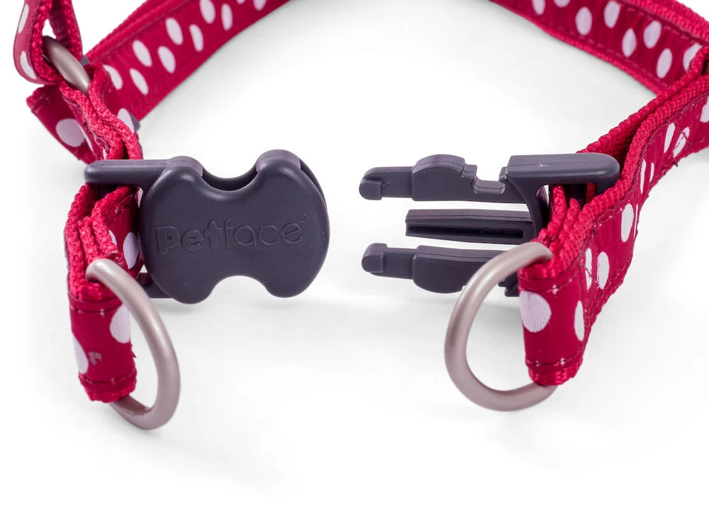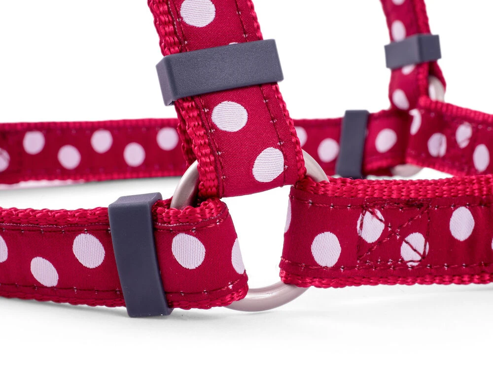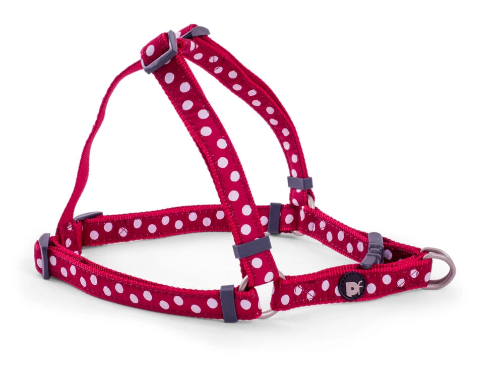 Petface cherry/white dog harness is made of high quality nylon material. Ideal for dogs prone to pulling and keeps your dog under control. The quick snap buckles make the harness easy to put on and remove. Provides maximum comfort for the dog. Perfect fit and comfortable to wear.Â